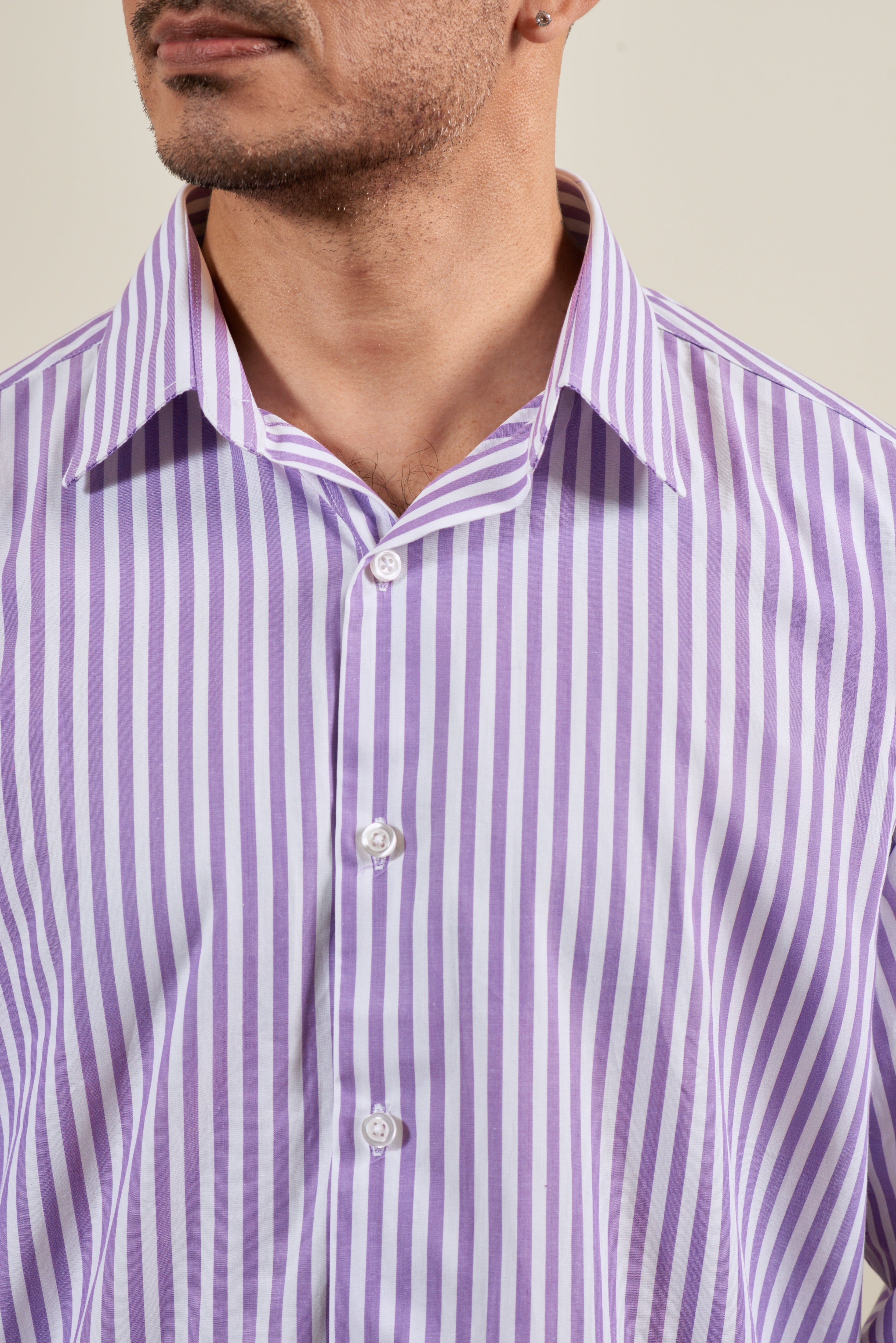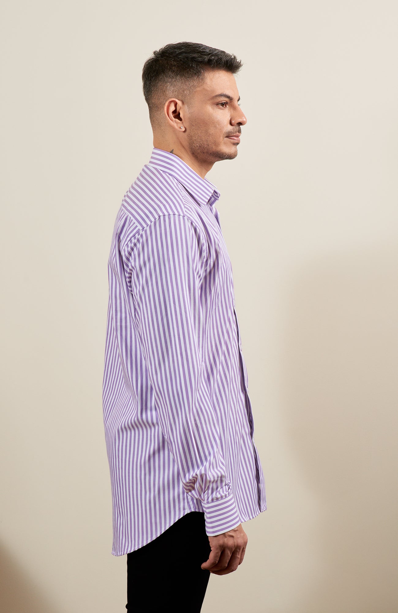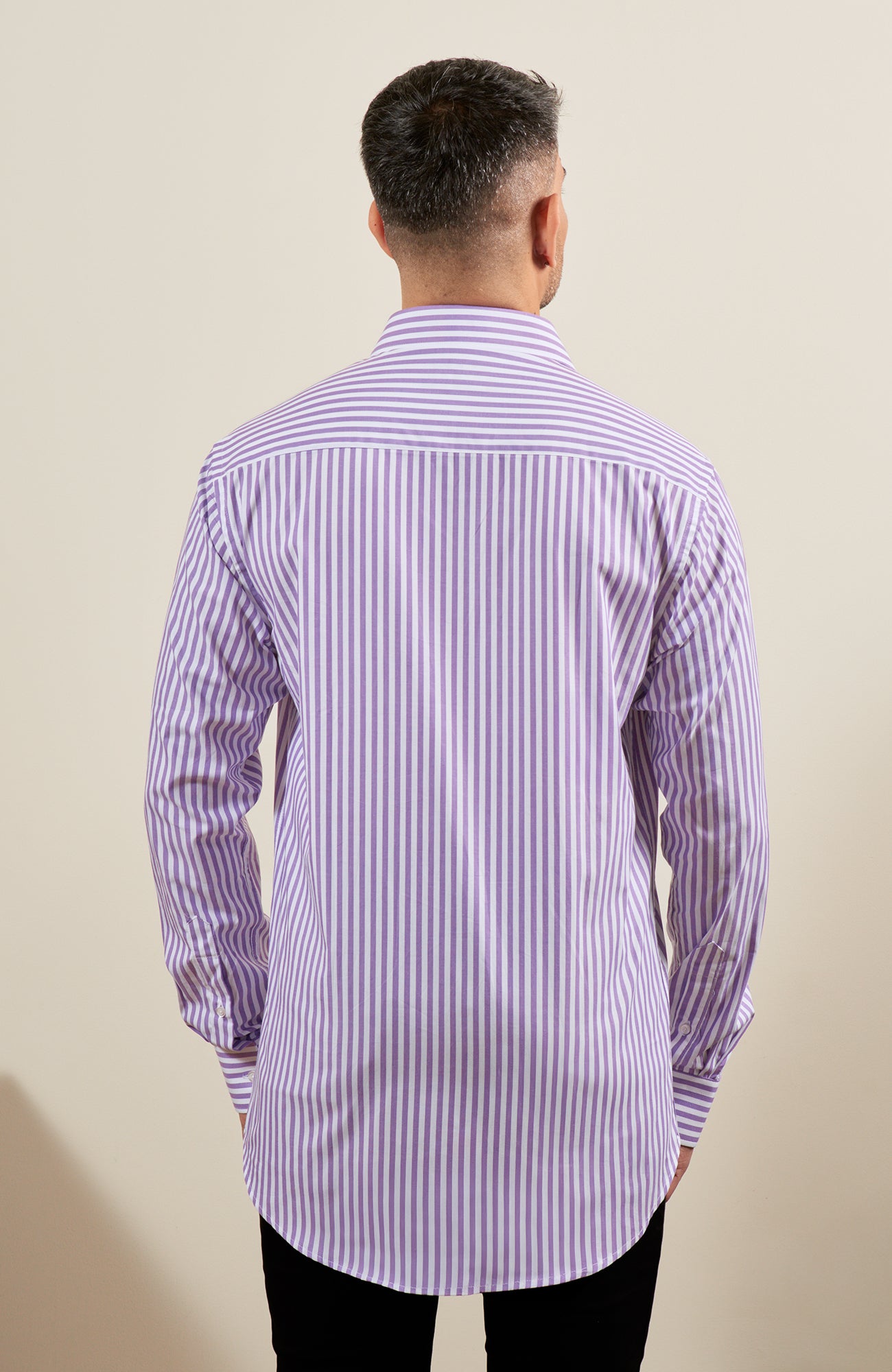 Color: Purple | Collar: Spread | Sleeve: Length Long | Placket: French | Fabric: Cotton 100% | Pattern: Stripes | Style Detail: None