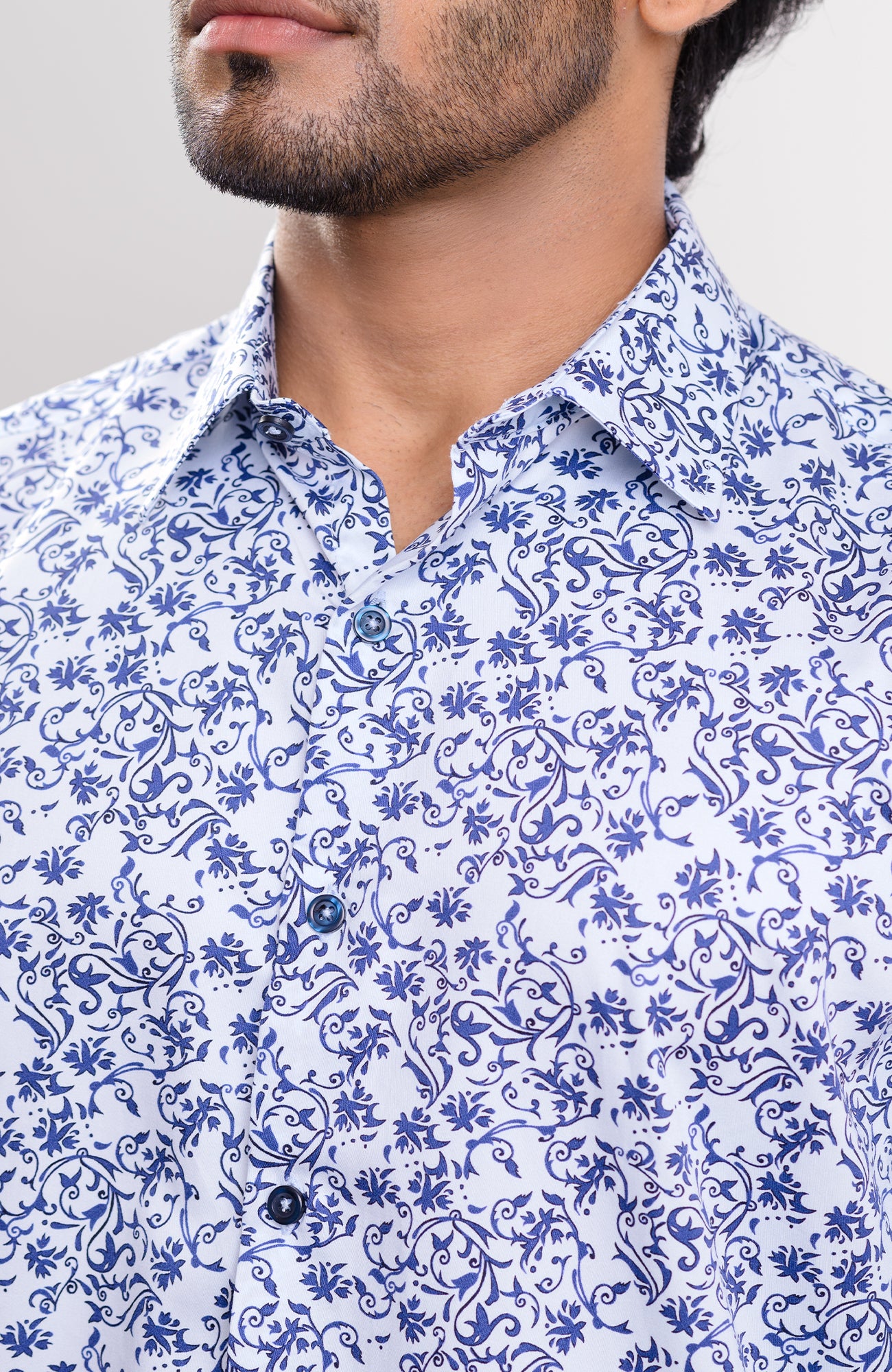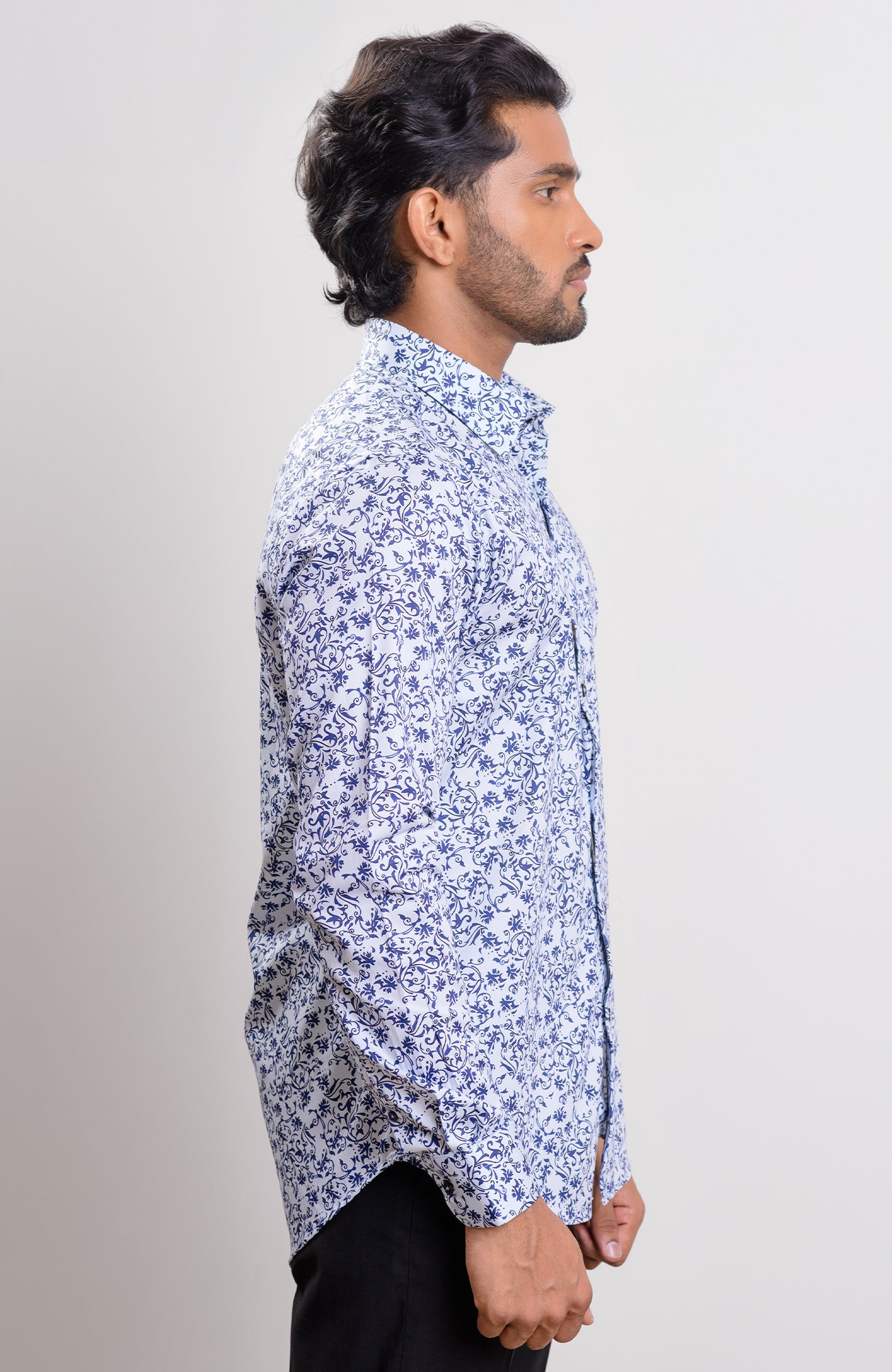 Light blue base dark blue floral print spread collar casual long sleeve shirt